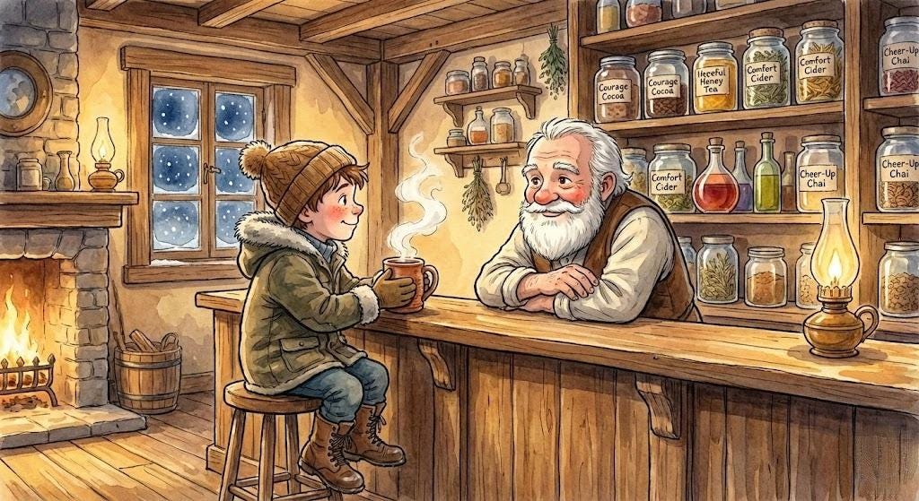 Behind the counter stood a kind old brewer with rosy cheeks and soft brown eyes.