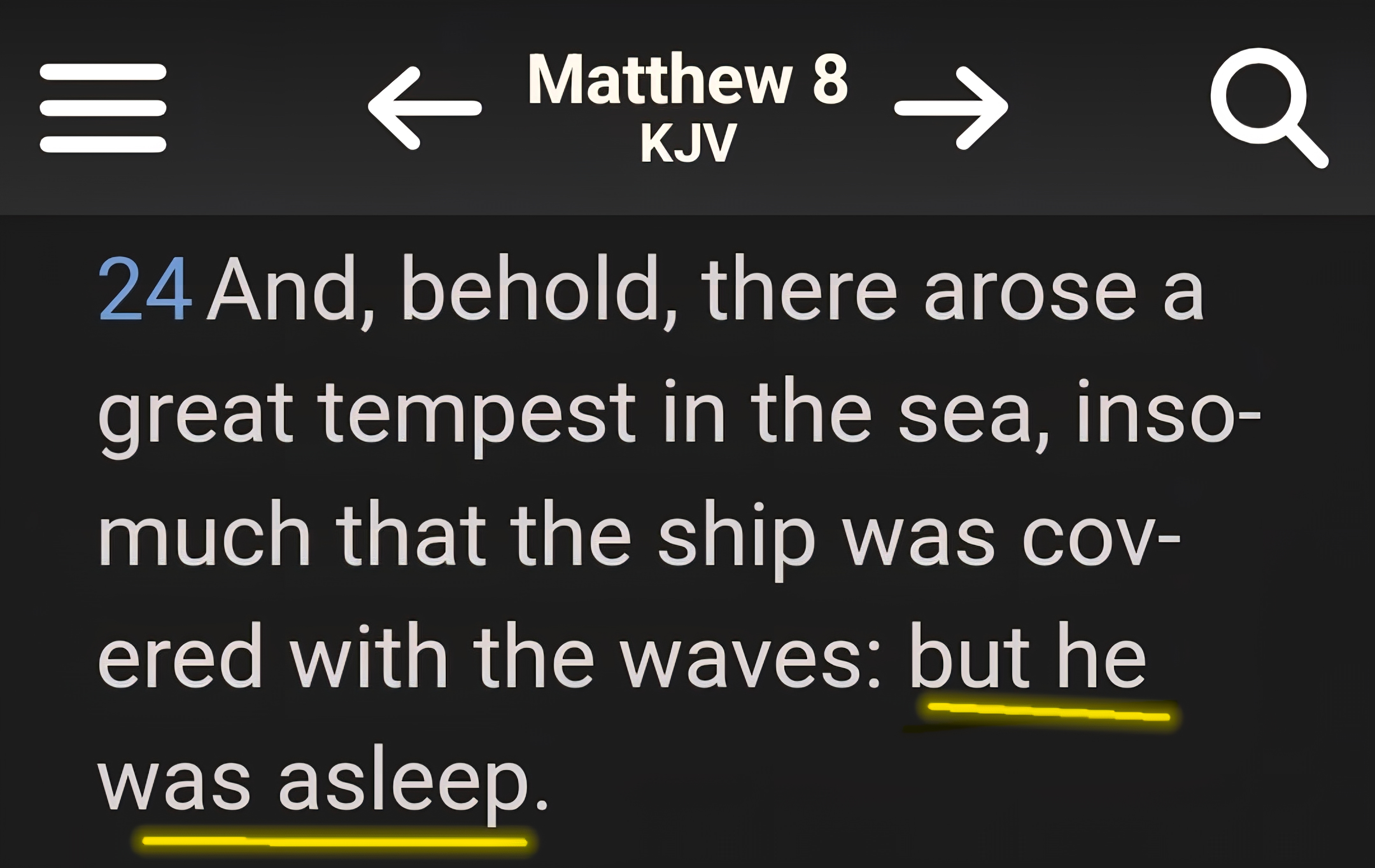Imagine being so unbothered by storms, even with the ship being covered with waves, that you’re sleeping in the boat.