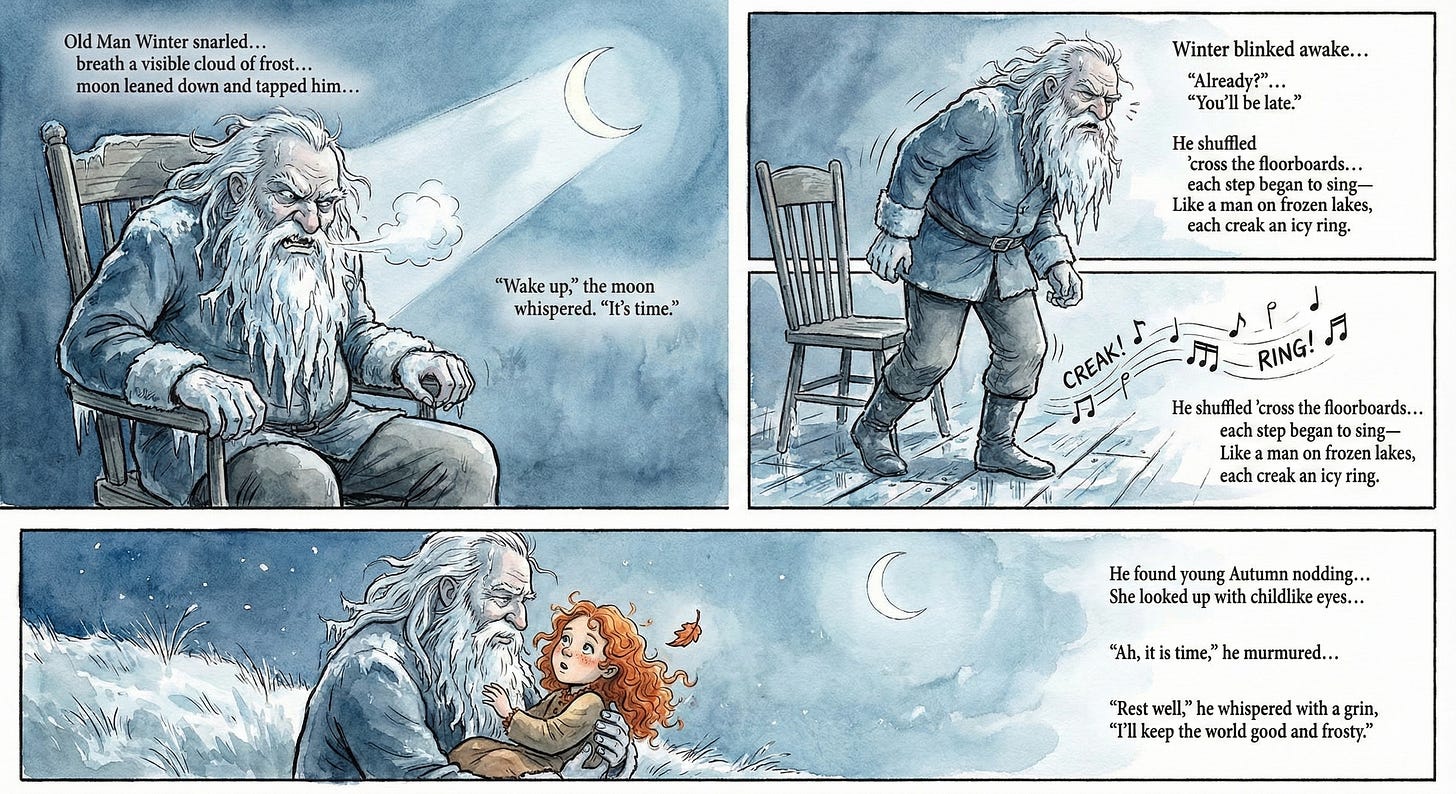 This was gorgeous. Soft, tender, and painted with real care. The way Winter carried Autumn like a grandfather tucking in his favorite child hit me right in the chest. It felt peaceful, almost protective. 🤍